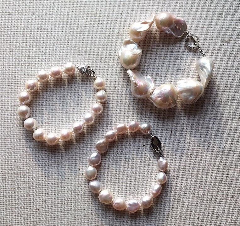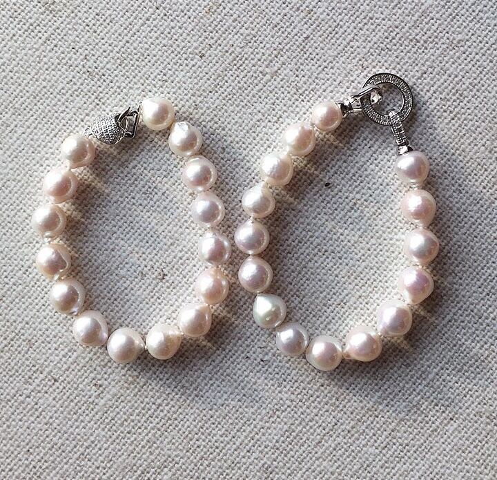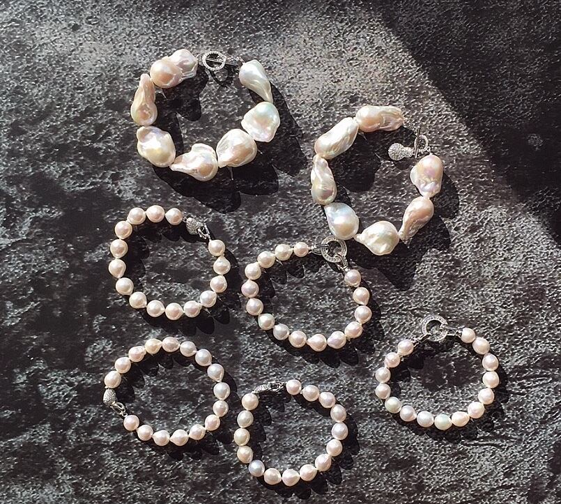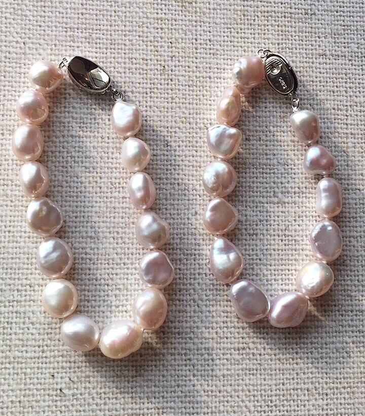 水滴形の淡水バロックパール(S),少し楕円形のボタンバロックパール(M)ブレスレット。