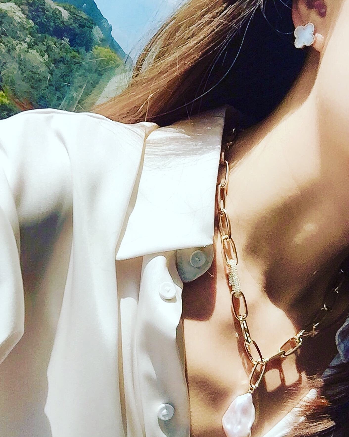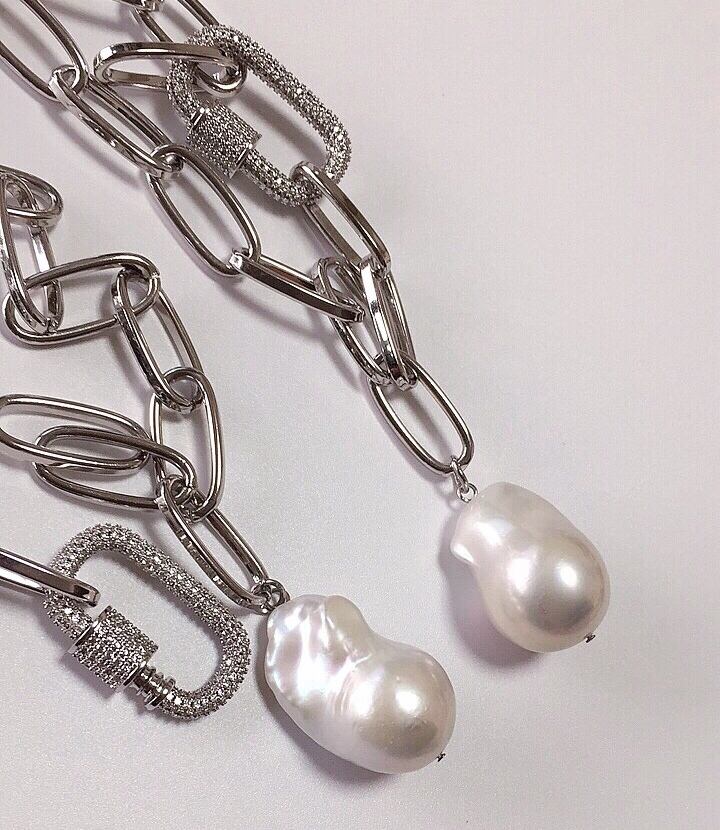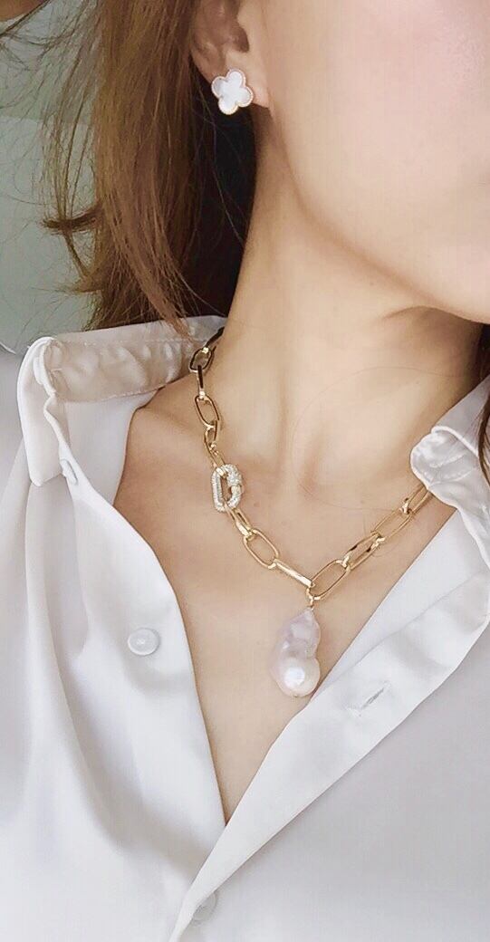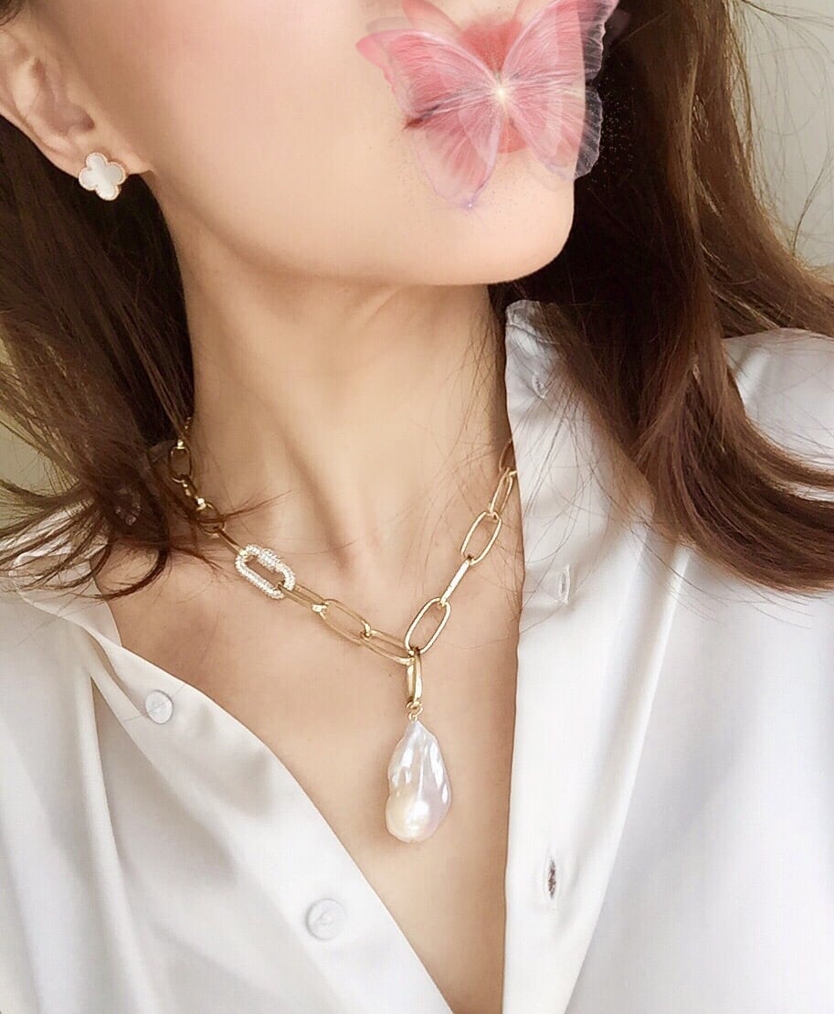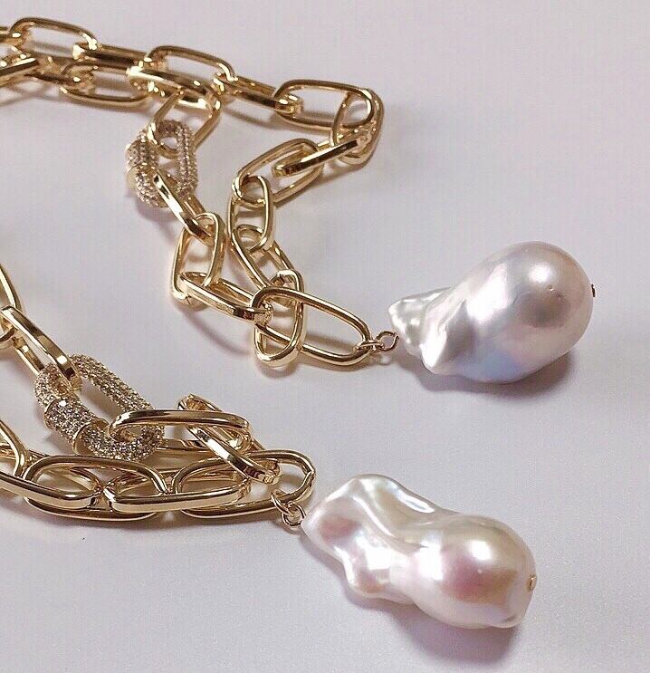 Sクラスの大粒バロックパールとゴールドチェーンでお洒落なネックレスを仕上げました。