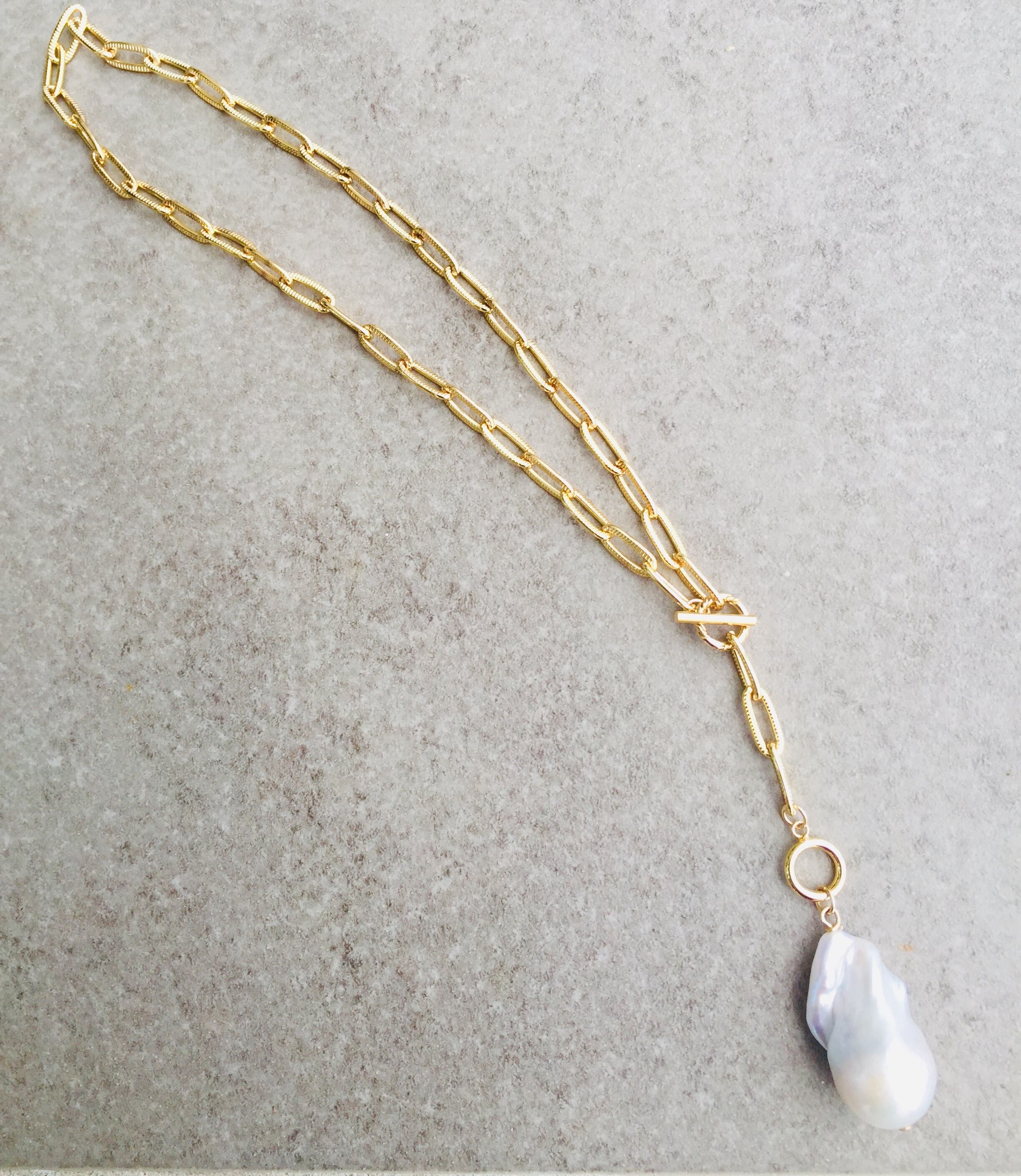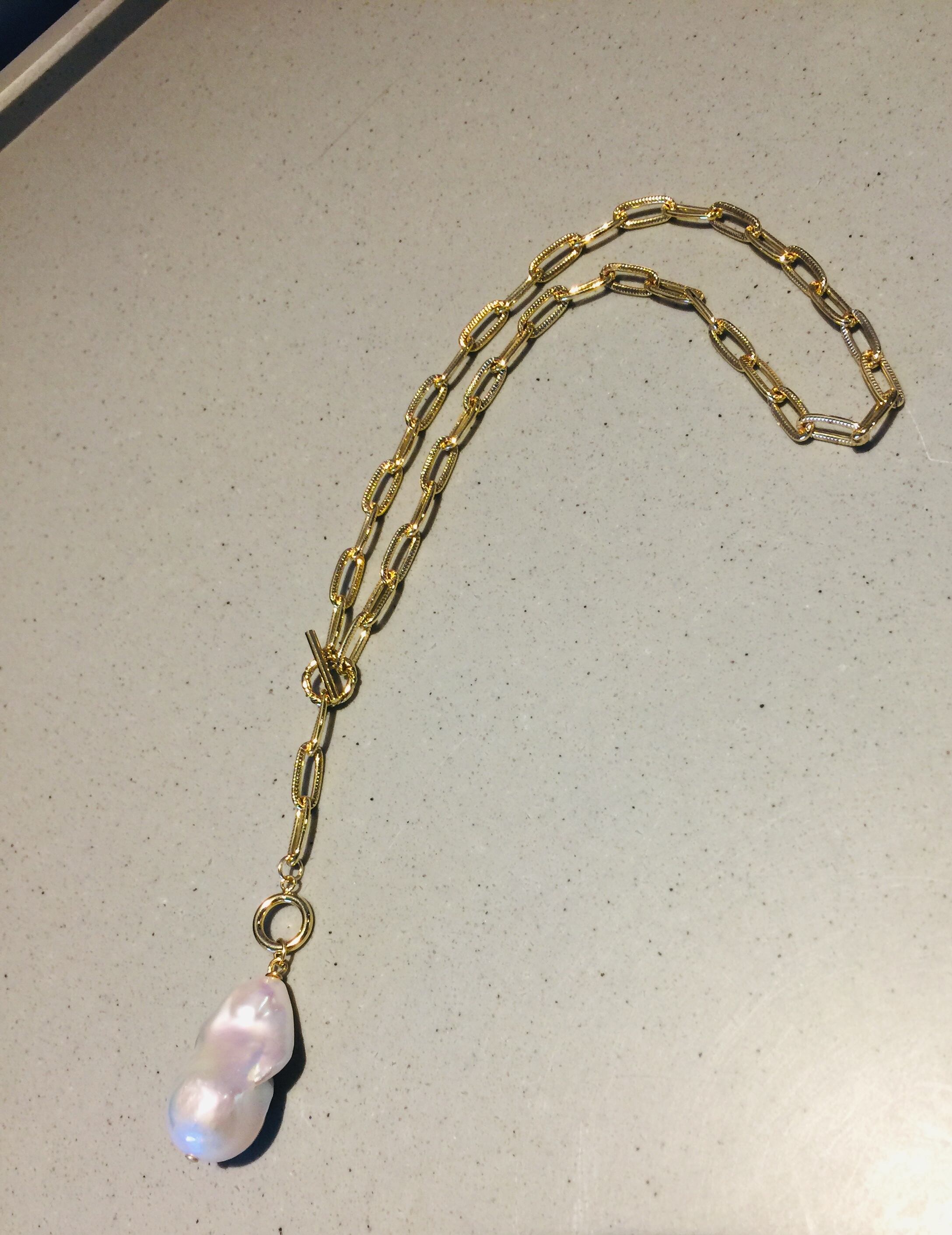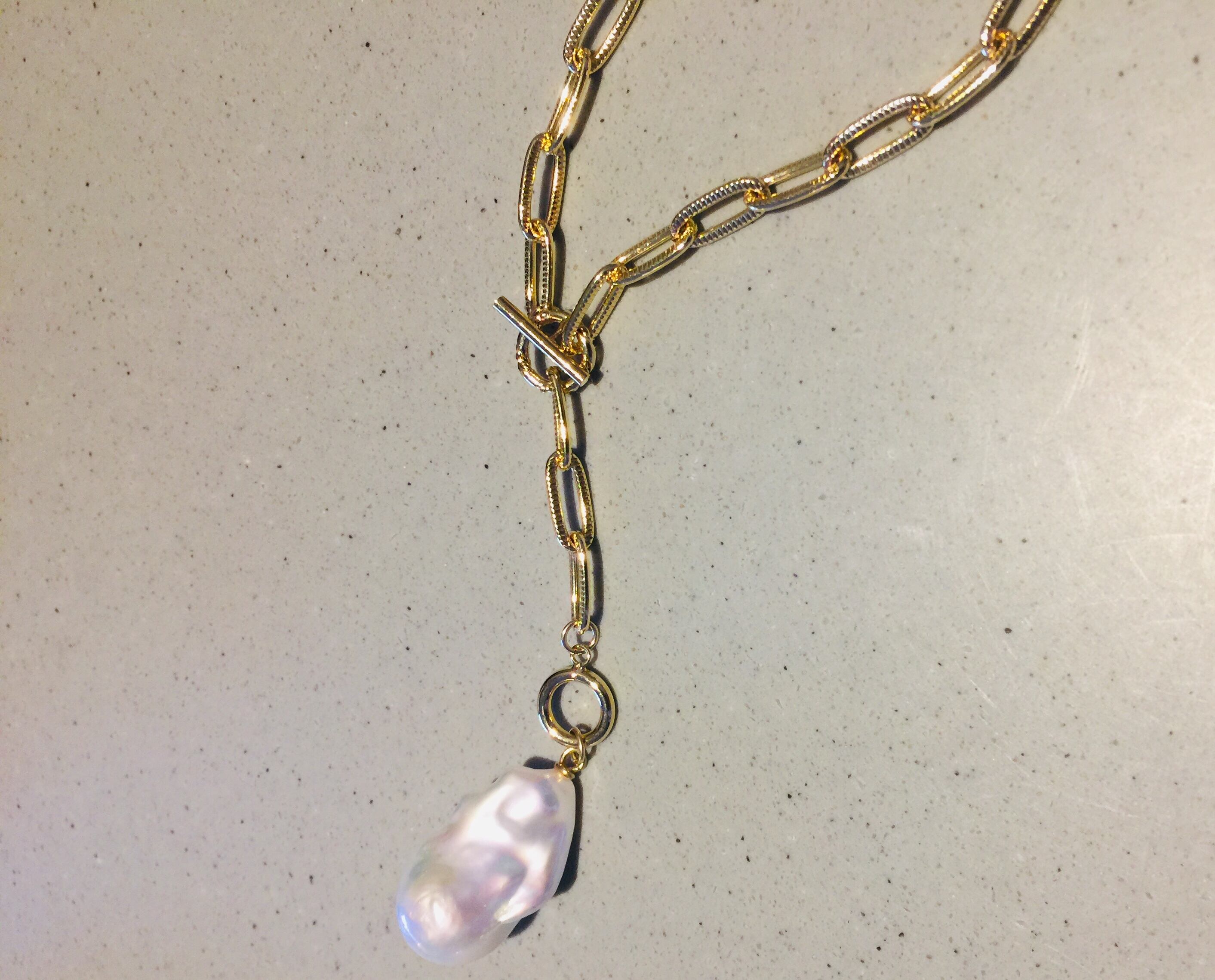 Sクラスの大粒バロックパールとゴールドチェーンでお洒落なネックレスを仕上げました。