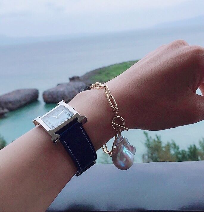 Sクラスの大粒バロックパールとゴールドチェーンでブレスレットを仕上げました。