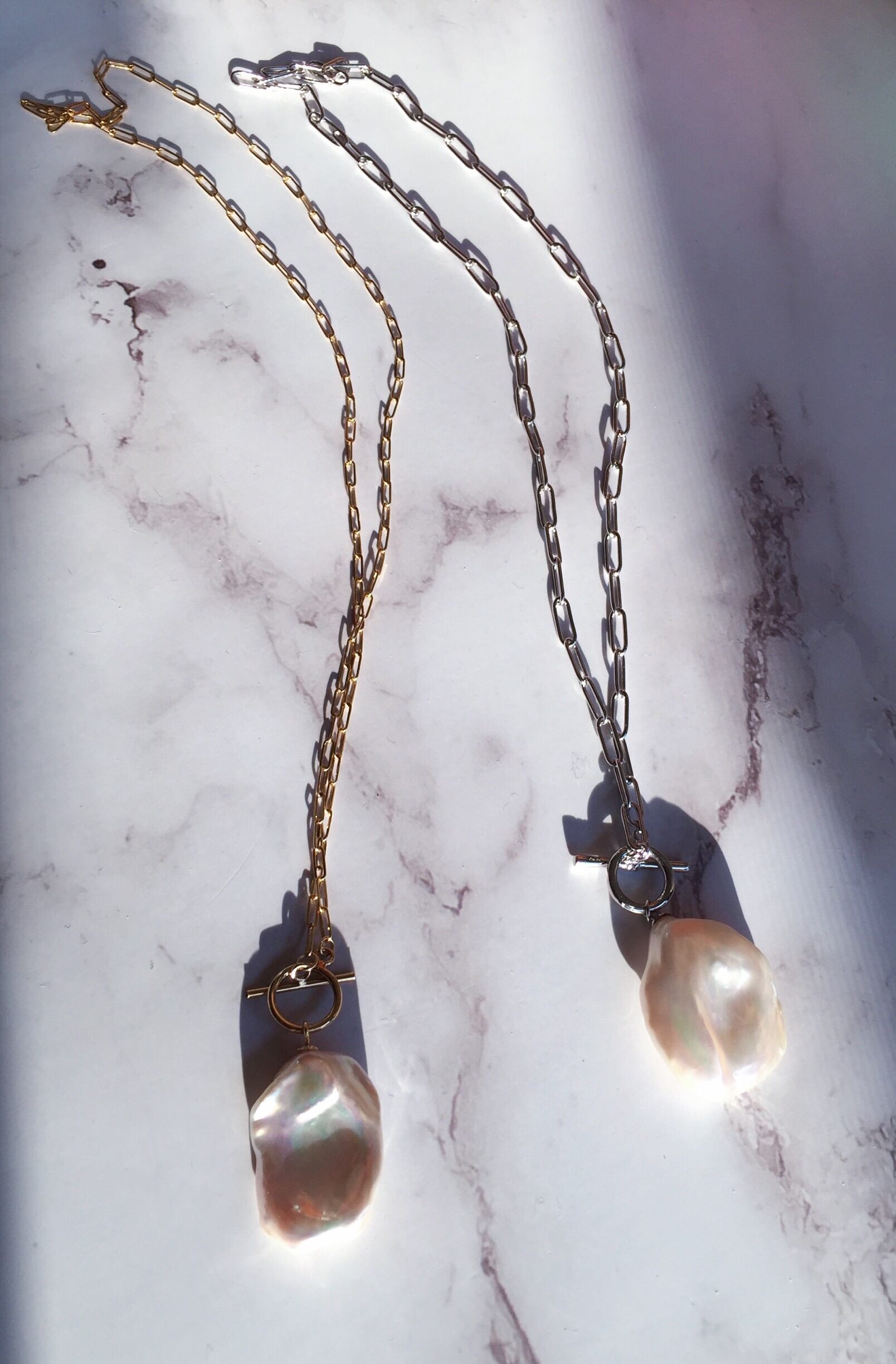 一粒の花びら淡水バロックパールとチェーンの組み合わせ。カジュアルの服装に似合うデザインです。