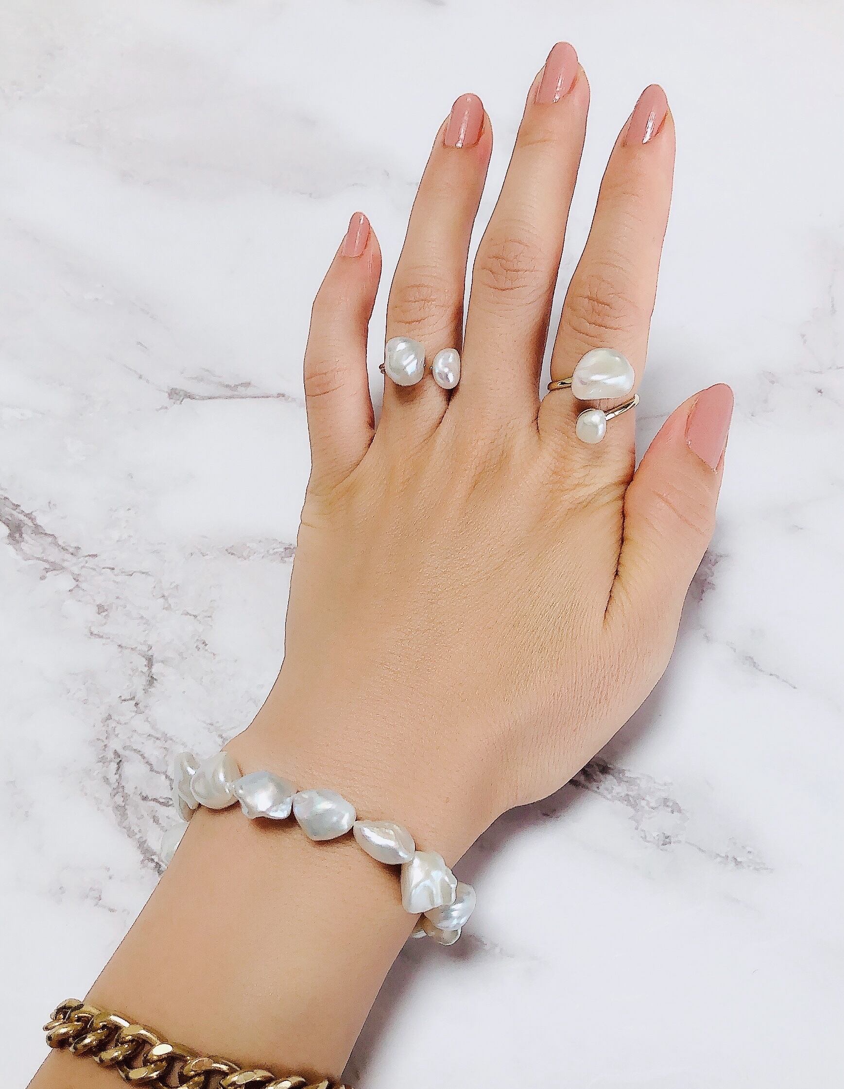高貴、神秘的なイメージのタヒチパールと大きい淡水パールのダブルリングです。(写真1-4)