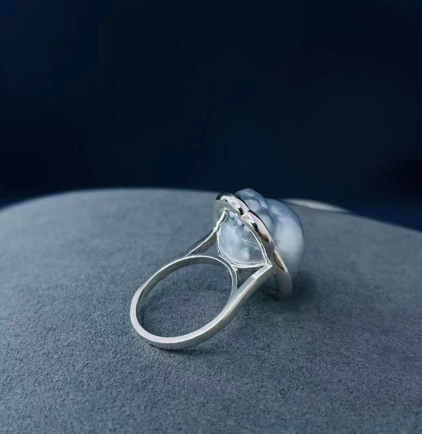 このリングはテリ,艶が優秀で更にエクボ,傷がないシルバー大粒バロックパールを,パール自体の美しさを際立たせるためにスタンダードな曲線でシンプルに仕上げました。