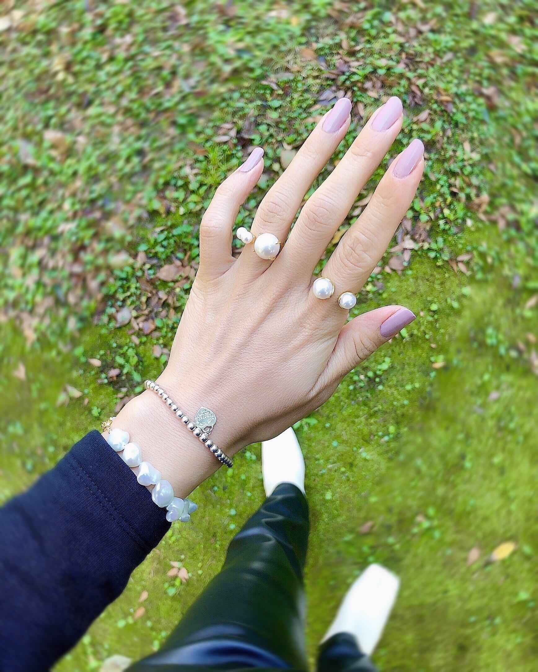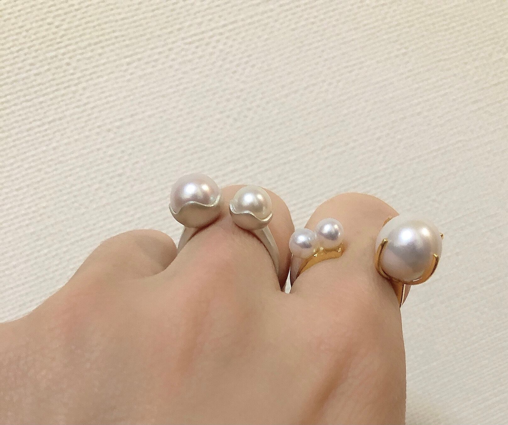 艶,テリがとても綺麗な大粒淡水パールとダブルベビーパールの組み合わせ,サイズのギャップで手元に遊び心も忘れずに華やかさを重ねてくれるアイテムです。